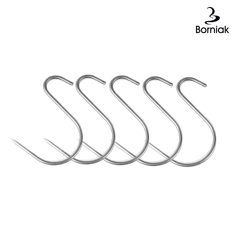 Asymmetriska S-krokar till kött. Anpassad för att bättre utnyttja utrymmet i rökskåpet, tar inte lika stor plats som andra krokar.